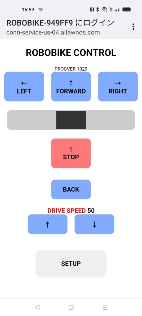 ROBOBIKEは、搭載するマイコンが内蔵するWiFi通信機能を活用し、スマートフォンから直接操縦できます。 ROBOBIKE本体が自らWi-FiアクセスポイントとなってWebサーバーを立ち上げ、スマホを接続するとすぐにWebの操作画面が表示されるので、専用アプリは不要です。