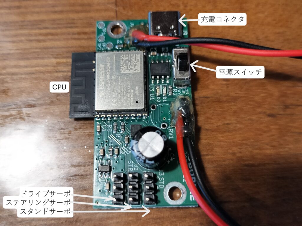 基板上のスイッチがOFF(下方へスライド)になっていることを確かめてから、サーボから出ているケーブルのコネクタを基板上の3ピン端子に接続します。サーボの接続は後ろから順に、ドライブ、ステアリング、サイドスタンドとなります。基板の表面に、[DRV]、[STR]、[STD]、のマーキングがありますので確認してください。
