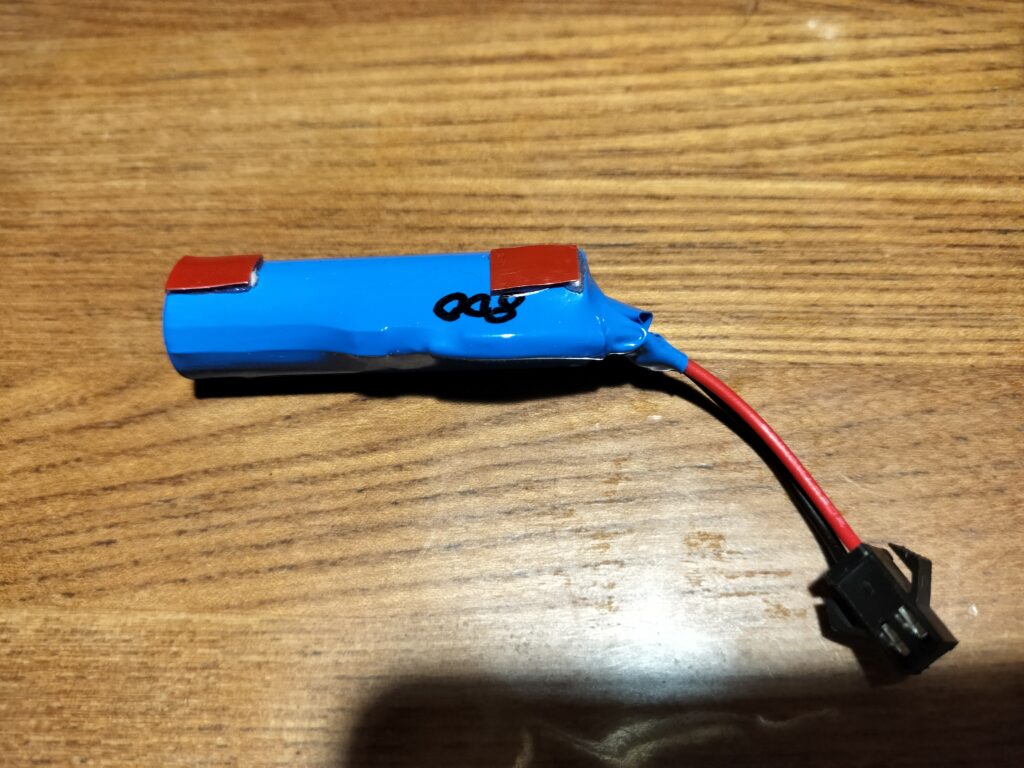 人形と電池をフレームに固定したら、基板から出ている電源ケーブルと電池を接続します。コネクターにはロック機構がありますので、しっかりロックが掛かるまで差し込んでください。配線の色が食い違っていることがありますが正常ですので、コネクターの向きを合わせて差し込んでください。