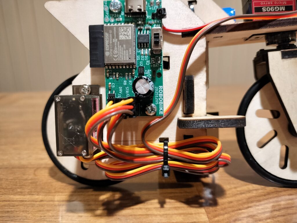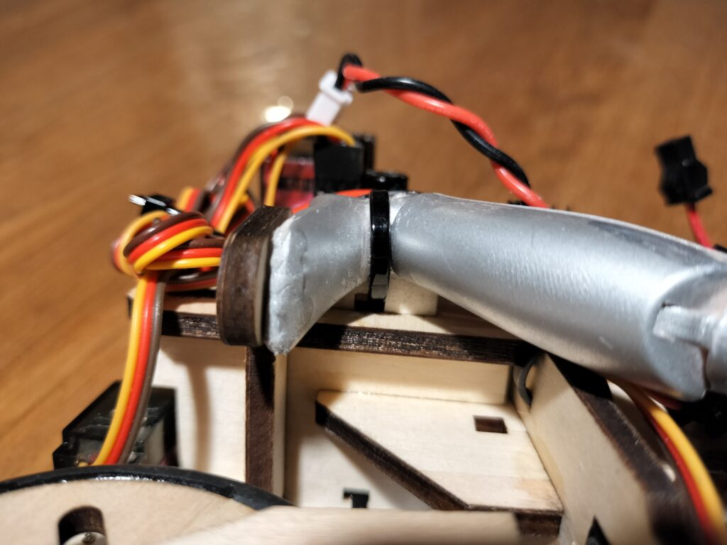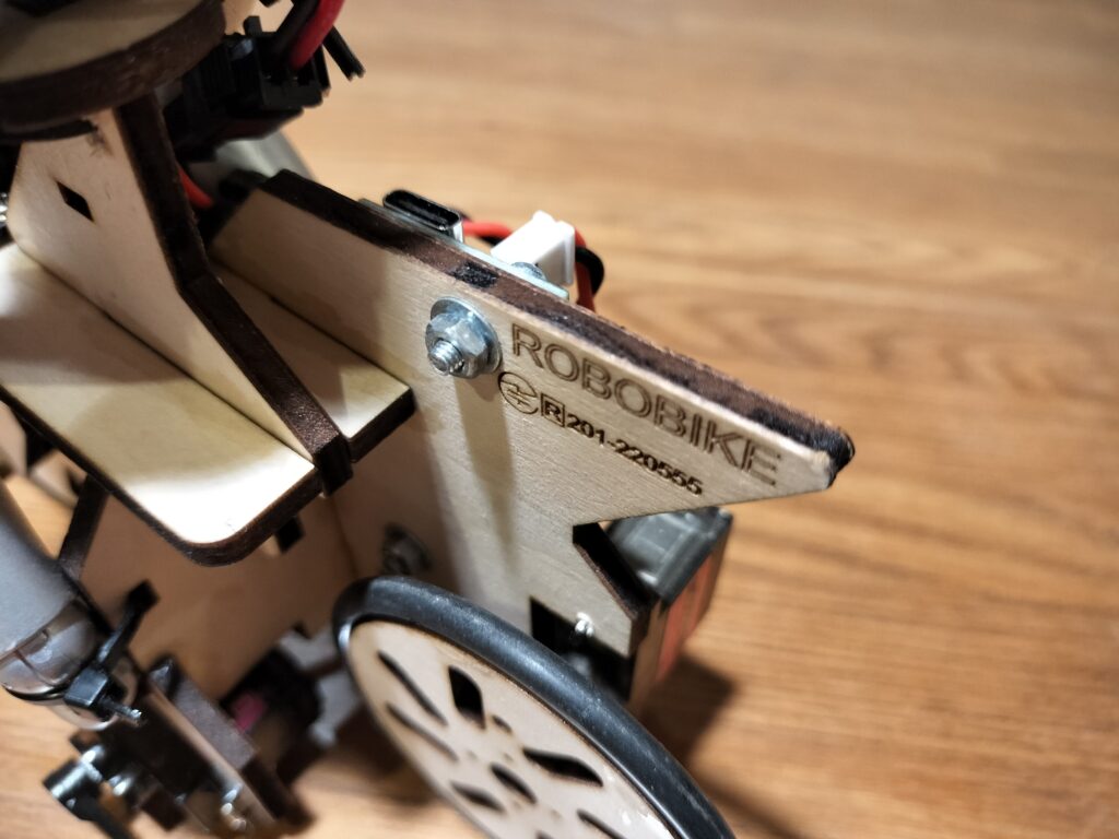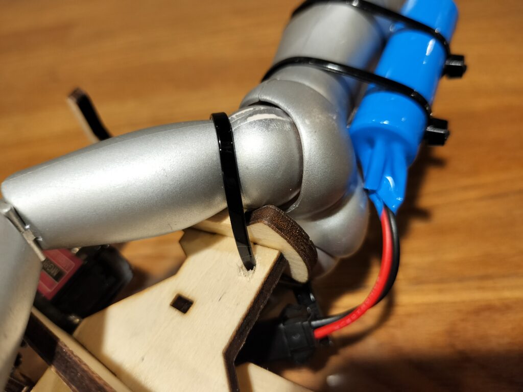 すべてのケーブルを接続出来たら、フレームNo.4の下の方に開いている穴に結束バンドを通して、ケーブルの余った部分をたたんで縛ってください。ケーブルを固定しないまま走行させると、軽い車体の揺れに対して重いケーブルが遅れて動くので、制御がうまく行かず転倒しやすくなります。また、車輪に絡まったり、その他可動部にあたらないよう注意してください。