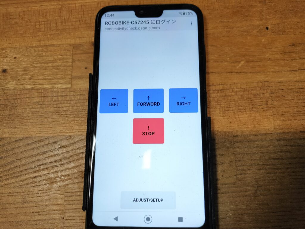 充電が完了したら充電ケーブルを外し、電源スイッチをONにします。スマートフォンの設定でWi-Fiの親機を選択する画面を出し、SSIDが ROBOBIKE-ABC012 のようなアクセスポイントに接続します。ABC012の部分は、個体ごとに違った数字になります。パスワードはありません。