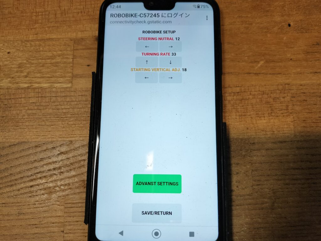スタート時は速度が遅くて傾きの修正ができないために、車体が傾いているとその方向に転倒してしまいます。これを防ぐため、発車するときに車体が垂直になるよう、サイドスタンドの角度を調整します。人形を手で支えて垂直に保持しながら、STARTING VERTICAL ADJ. の下にある[←][→]ボタンをタップすると、サイドスタンドが出てきて、スタート時の垂直保持の角度まで床を押して車体が立ち上がります。スタンドが出た状態で、手を離したときにギリギリ倒れない角度になるよう、左、右ボタンをタップして調整してください。