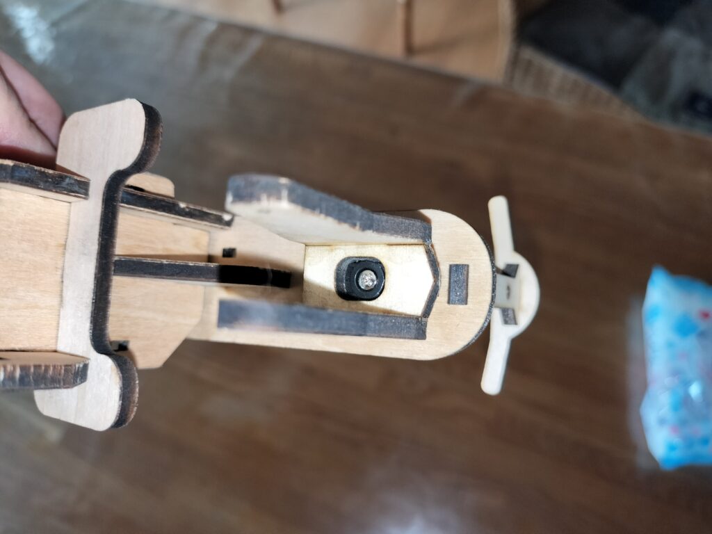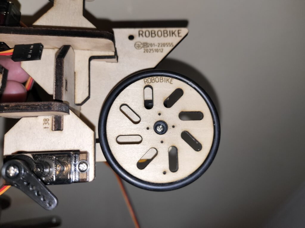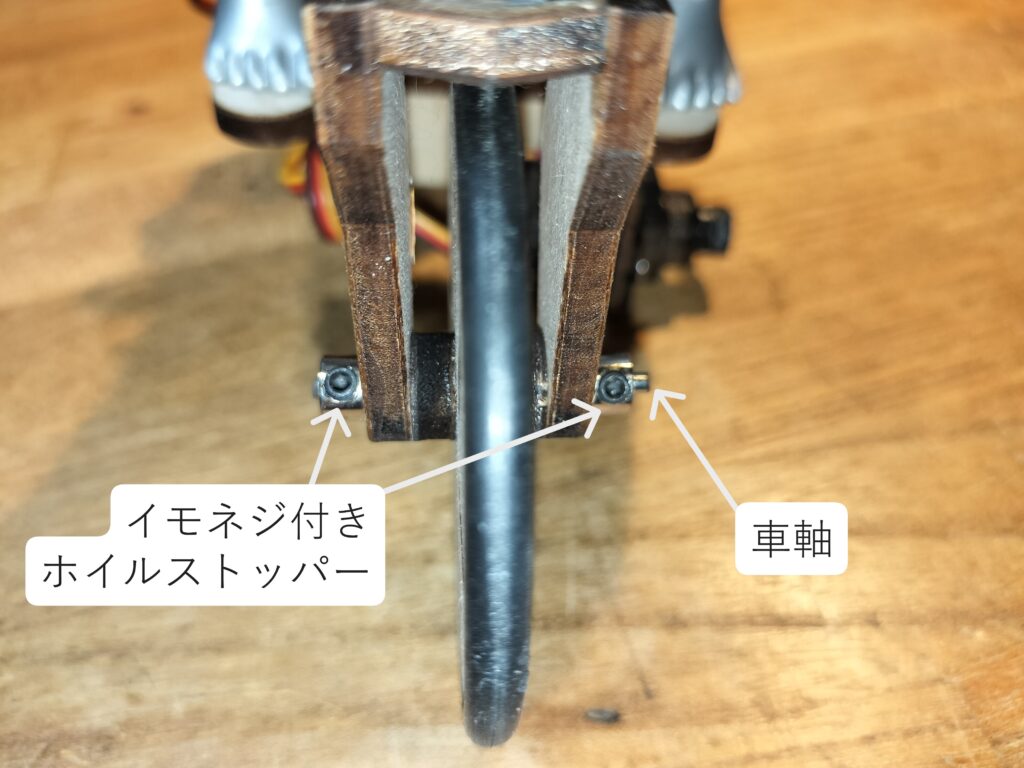 フロントフォークをサーボ出力軸にねじ止め出来たら、前輪をフォークの間に差し入れ、車軸を通します。フォークの両側に同じくらいはみ出るまで差し込んだら、車輪がクルクルと勢いよく連続回転するか、ガタが無いかを確かめてください。ガタなく軽く回るようでしたら、両側からホイルストッパーを嵌めてください。