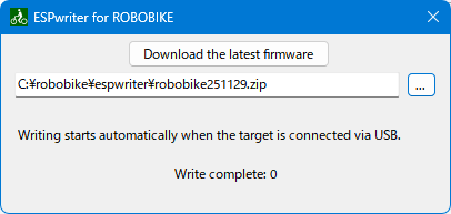 (ex. C:\robobike\espwriter\.....) - 書込みツールアプリ=espwriter.exe (ex. C:\robobike\espwriter\espwriter.exe)を起動すると、起動時に最新のファームウェアをダウンロードします。ダウンロードが完了するとダイアログが表示されるので、[OK]を選ぶと下の画面が表示されます。