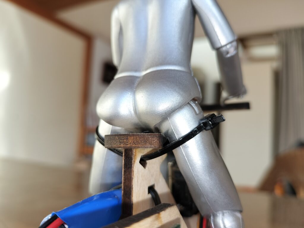 人形は写真のように、腰と左右の足首に結束バンドを巻き掛けて、サドルとステップに固定します。