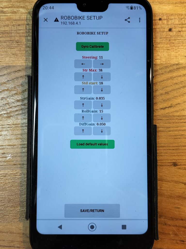 スタート時に車体が傾いていると、その方向に曲がって転倒してしまいます。 - [SAVE/RETURN]ボタンをタップして、調整結果を不揮発メモリ―に保存します。
