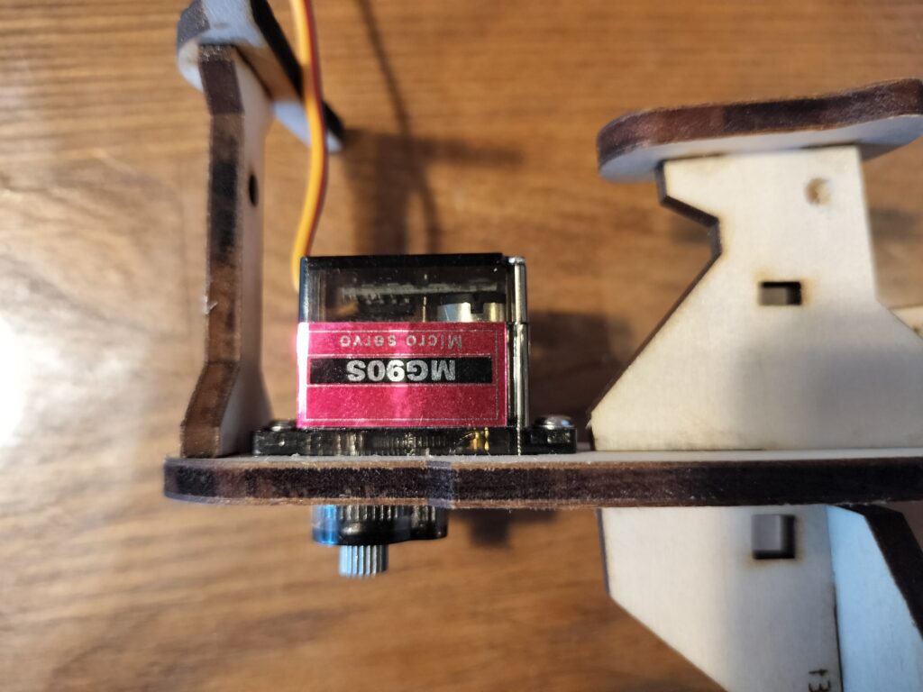 次にドライブサーボを取り付けます。出力軸が下になる向きで、フレームの右側から差し込んで取り付けます。