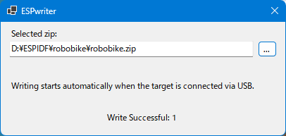 (ex. C:\robobike\espwriter\.....) - 書き込むファームウェアのzipファイル(robobikeyymmdd.zip)をダウンロード