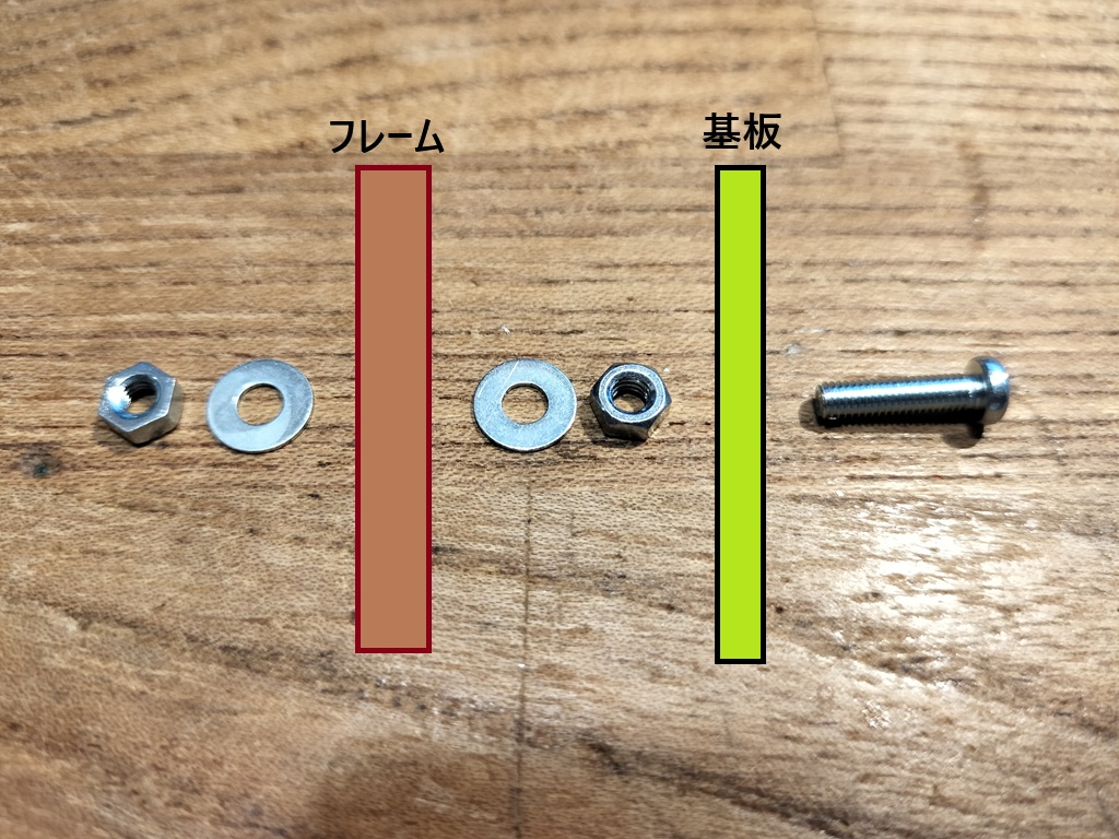 先に基板の取付穴2か所にM3X12ビスを差し込み、ナットで締め付けます。写真のような順序で、右からビス、基板、ナット、ワッシャー、フレーム、ワッシャー、ナットの順に組んで締め付けます。