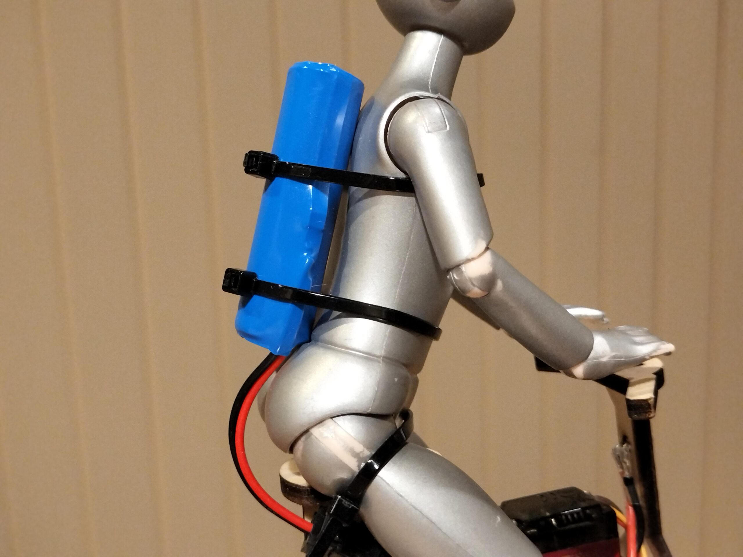 電池はロボットに背負わせ、結束バンド2本できつく縛ります。ズレ防止のため、電池の配線が出てくる付近の、人形の腰のくびれと電池のカドが接するところに少量の瞬間接着剤を付けておくとよいでしょう。