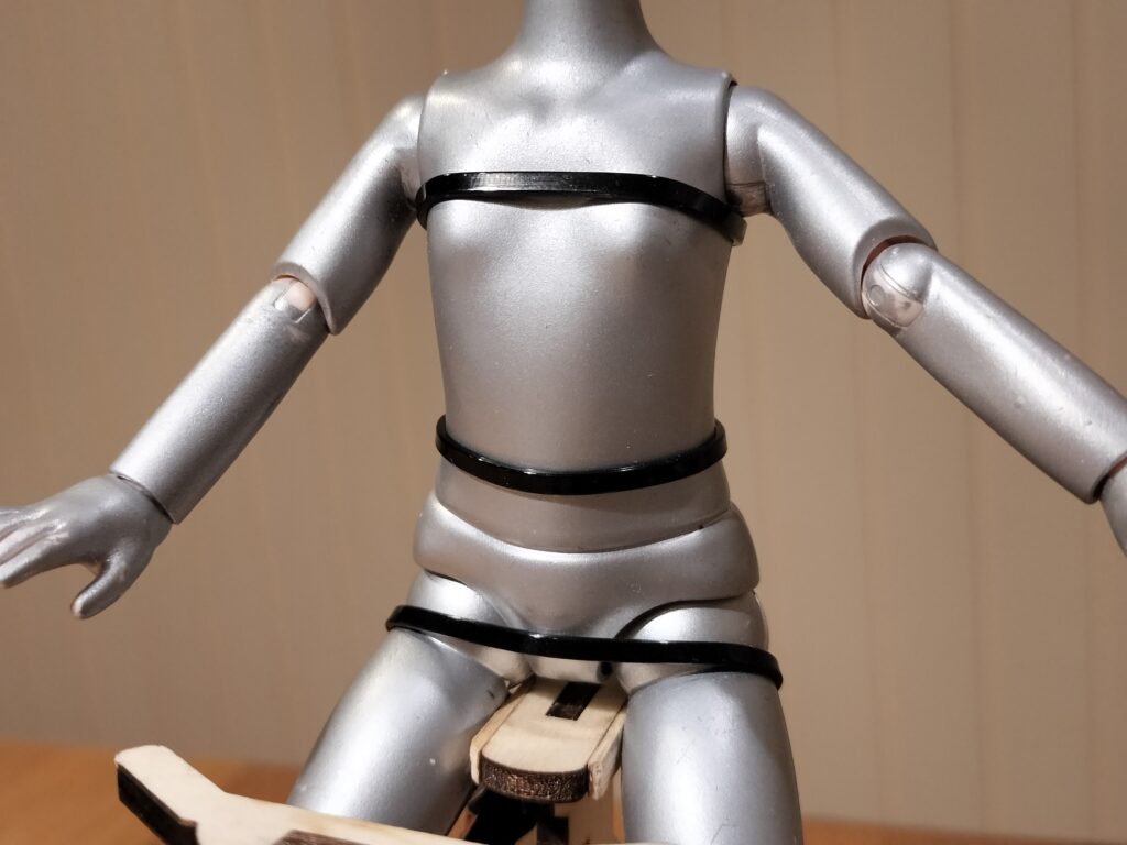 人形は写真のように、腰と左右の足首にも結束バンドを掛けて、しっかりとフレームに固定します。